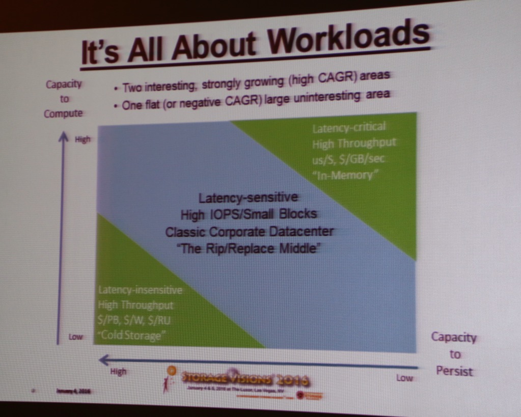 Much of Rob’s discussion included the rapid adoption of NVMe and 3D NAND. An ever-increasing trend that will bring about the ‘start to the end’ of many current storage commodities, such as planar NAND. Thinking of workloads, and the market demands, Rob shows us that there are really three main workload markets, an uninteresting latency-sensitive/high-IOPS area, the latency-insensitive/high-throughout market, and the latency-sensitive and high-throughput market.
