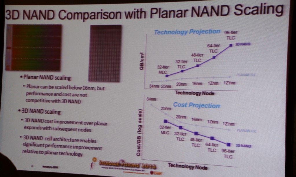 Rob also demonstrates the projections of 3D NAND as compared to Planar NAND. This companies technology projection as well as cost comparison, as seen in the image below. There is an obvious trend that planar NAND is coming to a plateau in both projections. Interestingly enough is the comparison between the 25mm planar NAND construction is compared to 32-Tier MLC 3D NAND.