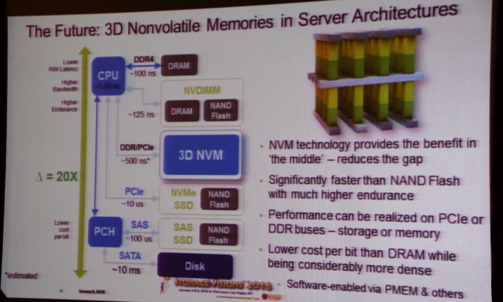 He also goes onto to speculate the future in server architectures in which they incorporate 3D Nonvolatile memory. This is much in thanks to 3D NAND, this bridges the gap between non-volatile DIMM and NVMe SSD solutions.
