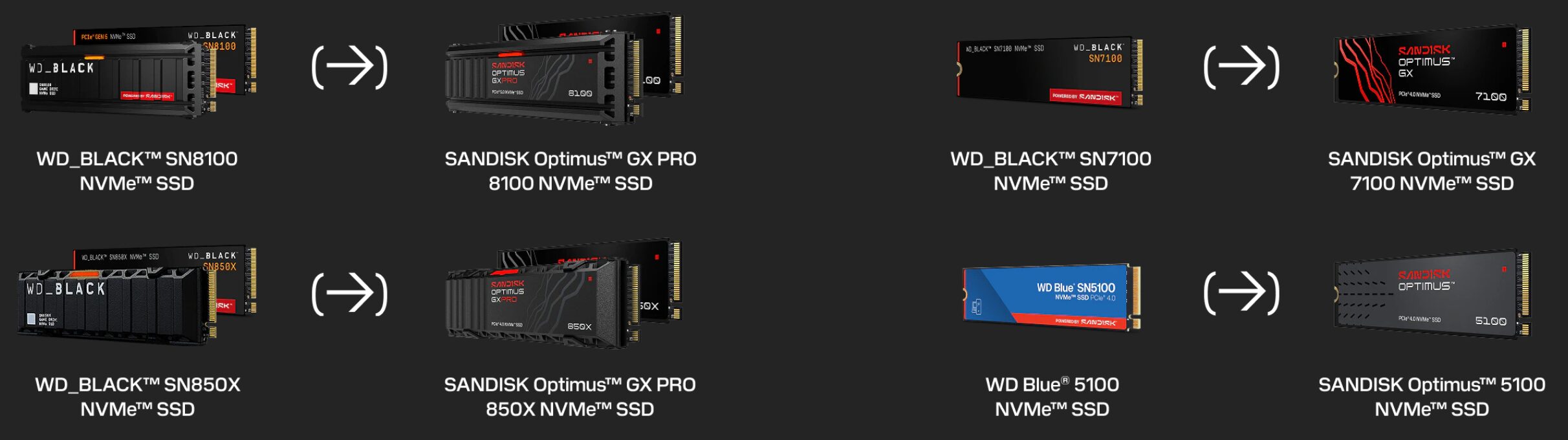 Not a massive SSD announcement, but nevertheless worthy of mention, is the fact that SanDisk has elected to rebrand their WD_Black and WD_Blue family of SSDs to their newest Optimus family name as of this morning at CES 2026. The WD_Black 8100 and 850x will now be designated Optimus GxPro with the SN7100 being renamed Optimus GX and WD_Blue 5100 now becoming the Optimus 5100 as shown in their released image here: