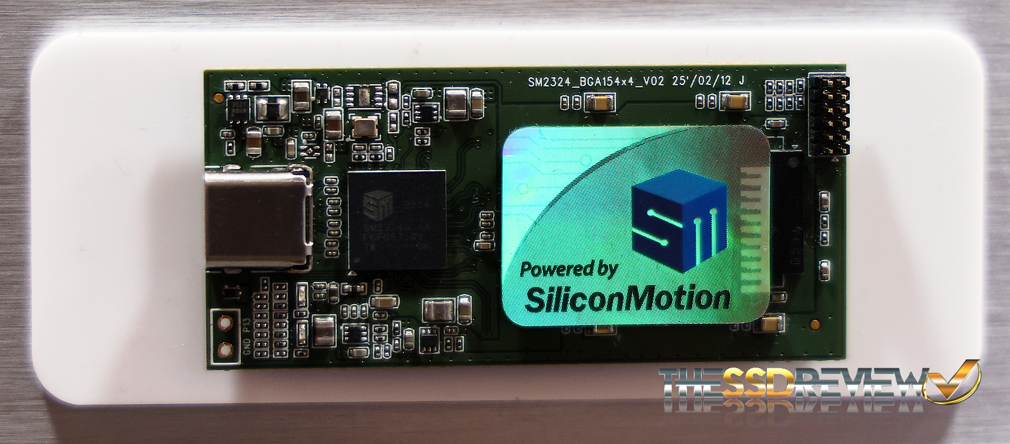 This photo above depicts the Silicon Motion SM2324 which is a single chip design that provides USB 4.0 support with power delivery. It provides up to 4GB/s read and write speeds and most might see this design within portable SSDs. It supports TLC and QLC NAND up to 32TB and, as this design is single chip, we just may see lower prices on these devices due to lesser BOM (bill of materials) cost.
