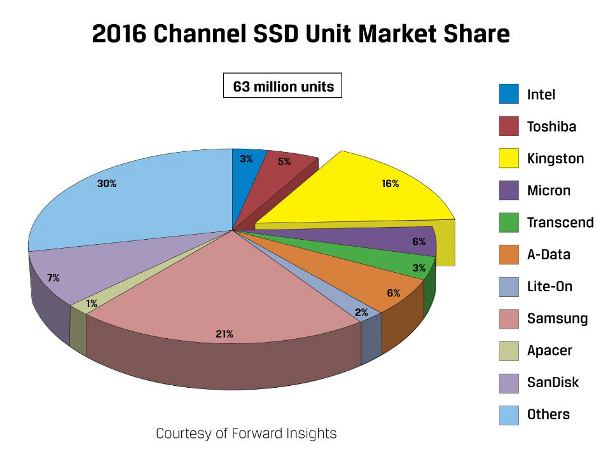 Kingston is announcing that they have been declared the shipper of the second-most solid-state drives (by units) to the worldwide channel in 2016, placing them at a 16% market share. This information is based on data compiled by industry analysts Forward Insights, who has been researching and analyzing the non-volatile memory industry since 2008. Forward Insights has been a key player in providing industry market analysis and information to a growing list of manufacturers that includes Kingston.