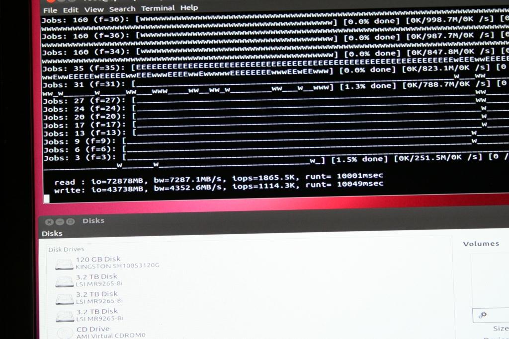 Using three LSI MegaRAID cards, 24 eMLC-based E100 SSDs, and an Intel based server, the test system was shown looping 4K random read and write tests. The result? Over 7,200MB/s of throughput on reads, and well over 4,000MB/s on writes.