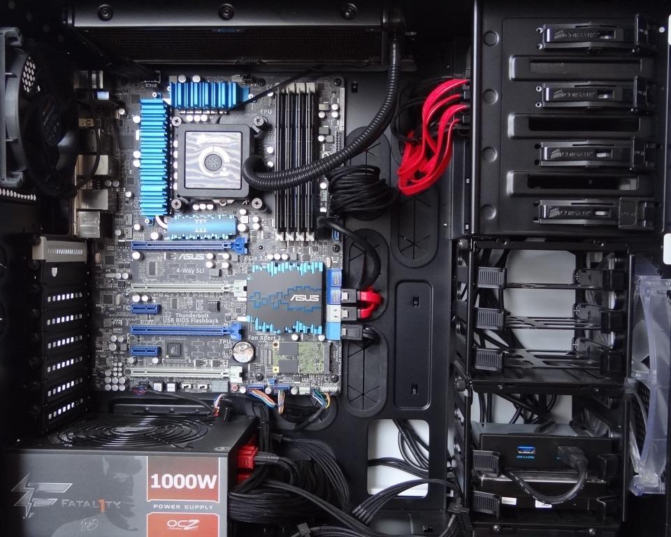 As a quick look, this is our new Test Bench with the Asus P8Z77-V premium inside the Corsair 600T chassis and containing the Intel i7-3770k which is cooled by the Corsair H100 Liquid CPU Cooler overhead. Memory is comprised of 32GB of Crucial Ballistix Sport and power is supplied by the OCZ Fatal1ty 1000w PSU.