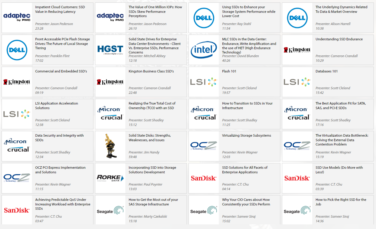 From there, the choice of ‘On Demand’ webinars is too good to overlook with topics that include Client and Enterprise SSD Overviews, Solid State Disks: Strengths, Weaknesses and Issues, PCI Express Implementation, How to Pick The Right SSD For The Job as well as lectures that discuss SSD performance and endurance testing. Clicking on the picture will give a high resolution picture of just a few of the webinars.