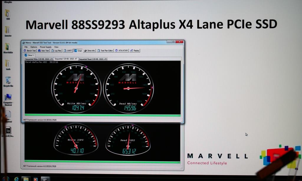 Not to be left out in the cold, Marvell also displayed somewhat of a surprise with the official unveiling of their PCIe M.2 SSD controller, named the Altaplus. The Altaplus is a X4 lane PCIe SSD controller with a product number of 88SS9293. Although displayed performing at 1.4GB/s, Marvell engineers were comfortable stating that this could be higher once their partners fine tuned this controller with their own firmware expertise.