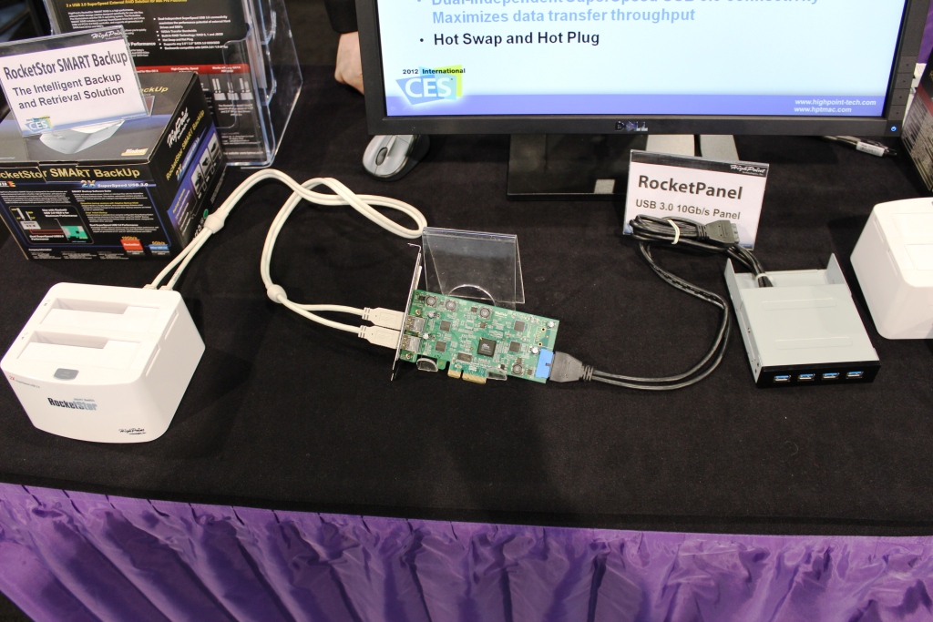 Next up we have a few new USB 3.0 defvices that HighPoint will be releasing soon. The RocketStor utilizes two USB 3.0 cables connected to a USB 3.0 Host Bus Adapter to give some amazing results with a dual port HDD enclosure. This supports all 3.5 and 2.5 inch HDDs and SSDs.