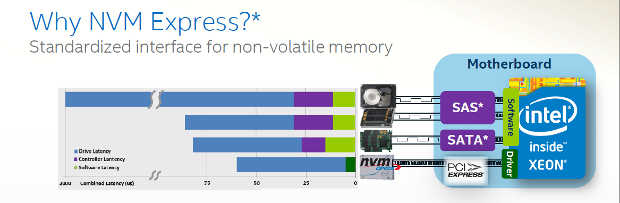 What is fueling the move to NVM Express (NVMe) as the standardized interface for non-volatile memory? Higher performance is achieved via lowered latency and the ability to handle full duplex and process multiple outstanding requests simultaneously. This means that no HBA or overhead protocol is required. The direct attachment to CPU access completely eliminates HBA costs and their associated power requirements. Power management is now facilitated right at link level. The NVMe interface can provide up to six times the throughput of the SATA 6Gb/s interface.