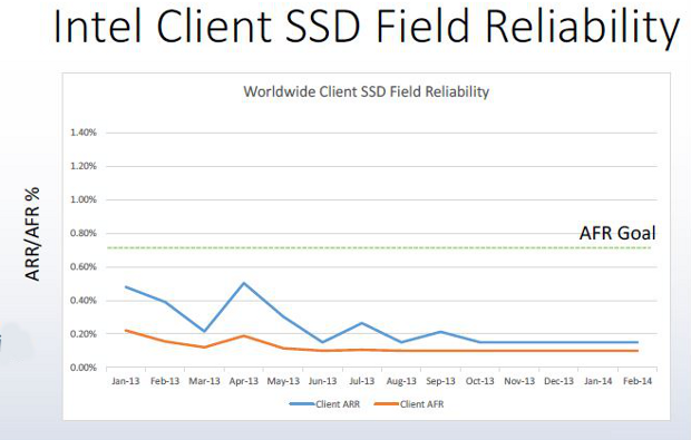 Historically, Intel’s SSDs have been some of the most reliable available, and this trend continues with the Pro2500 series of Intel SSDs. Intel SSDs are subjected to 5000 unique tests, utilizing 120 different client systems to achieve validation. Reliability is ensured via rigorous component and module qualification, system-level reliability demonstration testing, burn-in testing, and outgoing quality and reliability monitoring. This stringent validation and qualification regimen results in an average failure rate (AFR) (Pro1500 model) of less than 0.3%. Intel has no qualms in backing the Pro2500 series with a five-year warranty.