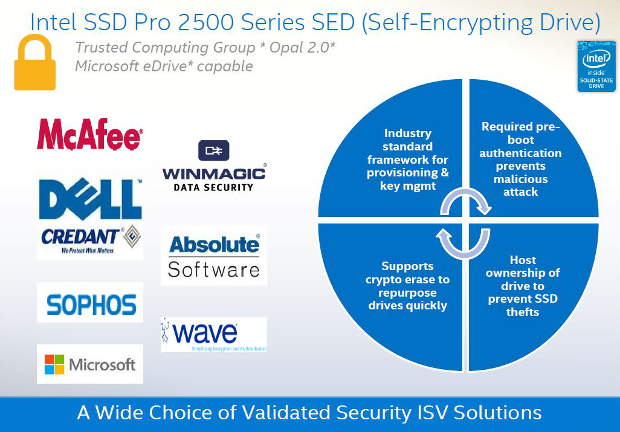 Intel’s Pro2500 series of self-encrypting drives utilize an industry standard framework for provisioning and encryption key management. These drives require pre-boot authentication to prevent malicious attacks, and host ownership of the drives to prevent SSD thefts. Crypto erase is also supported to enable quick re-purposing of drives.