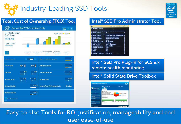 Intel also includes with the Pro2500 series an industry-leading suite of SSD tools to enhance manageability and end-user experience, along with a total cost of ownership (TCO) software tool to justify return on investment (ROI). The drive administration tools include the SSD Pro Administrator Tool, the SSD Pro Plug-in for SCS 9.X remote drive health monitoring, and Intel’s Solid-State Drive Toolbox to handle tasks such as overprovisioning, firmware updates, and a secure erase function.