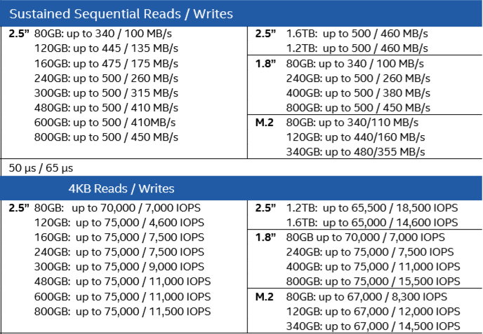 The M.2 form factor model is available in 80GB, 120GB, and 340GB capacities and offers sequential speeds of up to 480MB/s read and 355MB/s write and up to 67,000/14,500 IOPS read/write. Average sequential latency is rated at 50 µs for read and 65 µs for write for the M.2 models with a read/write quality of service of 500 µs / 5 ms (99.9%). Average sequential latency is rated at 55 µs for read and 66 µs for write for the 1.2 and 1.6TB models.