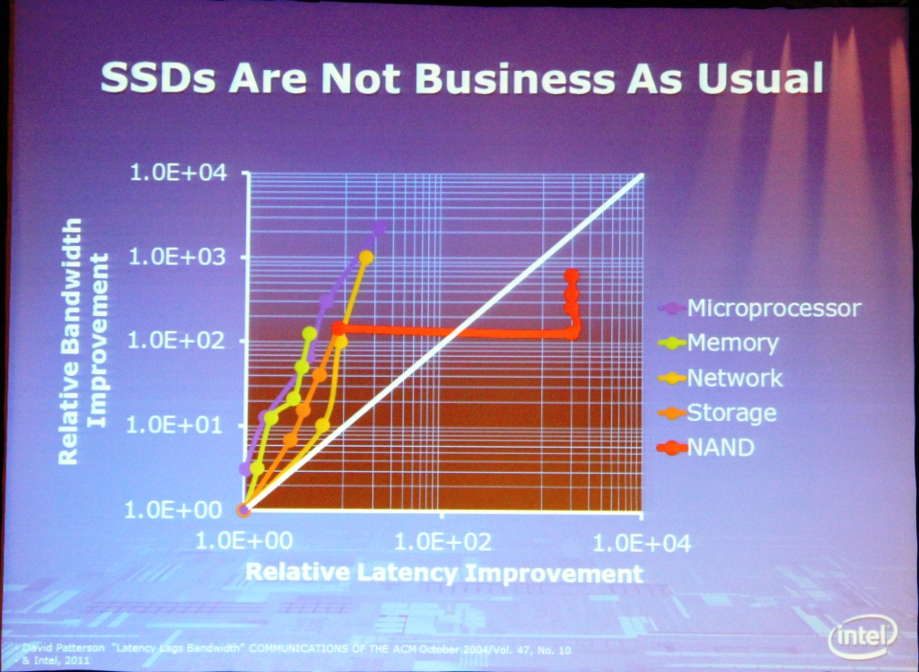 It is obvious that the bandwidth, and most importantly the latency, of SSDs have improved extremely quickly outstripping the others. The latency performance has exploded, which reaps huge results for end users.