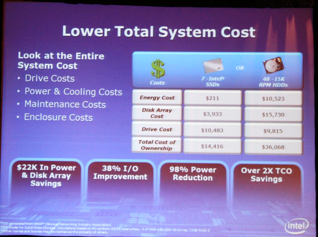 One of the largest selling points of Intels’ Enterprise class SSDs is the TCO, or Total Cost of Ownership. It is easy to see why, with the long term costs of SSDs v HDDs in an enterprise scenario being ridiculously cheaper.