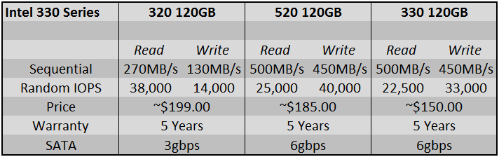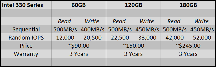 The new Intel 330 Series SSD should be available in three capacities at launch: 60GB, 180GB, and 240GB.