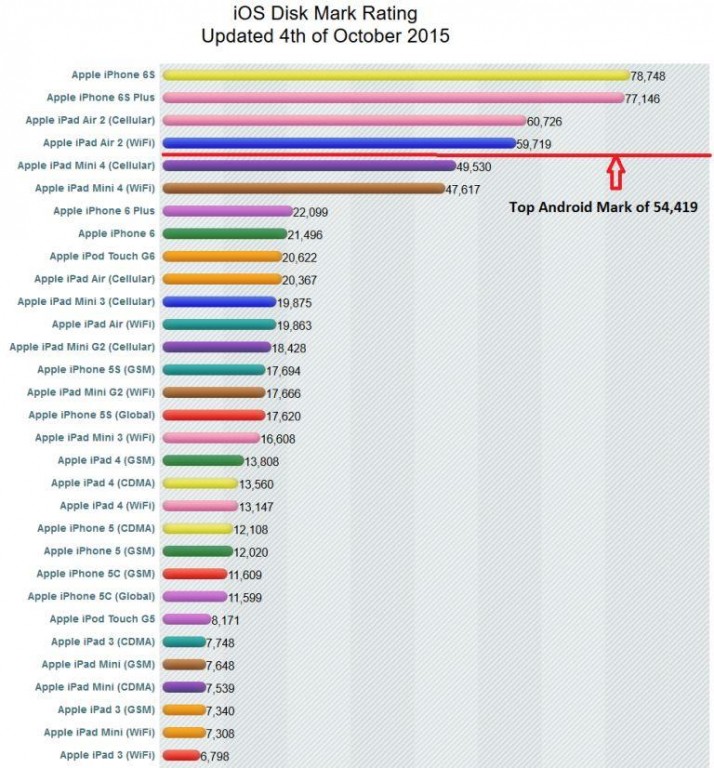 Let’s first check out the PassMark iOS Disk Mark ranking of IOS devices and take a look at where the best Android device would fit in with a high point score of 54,419 points: