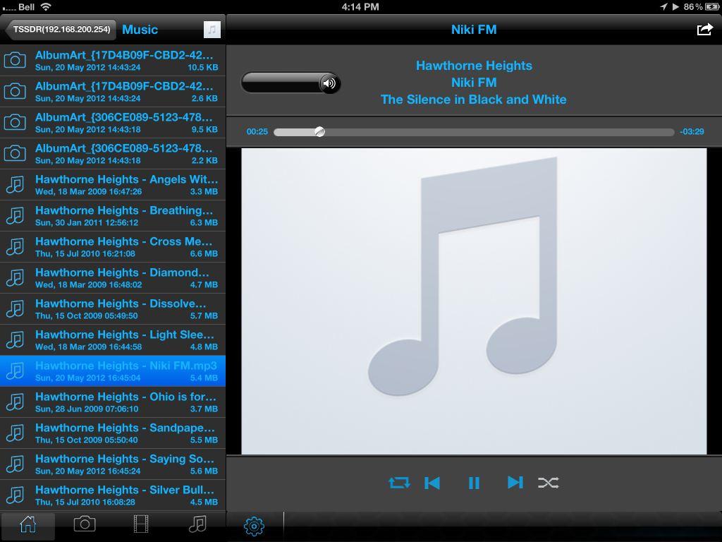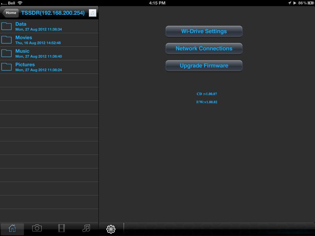 All Wi-Drive Apps are free and creating folders is easily done while the unit is connected to the PC. In this instance, we have created folders for data, movies, music and pictures. The picture on the left depicts the Setup screen and shows the folders while, on the right, we have chosen the music folder: