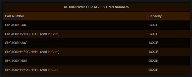 The KC1000 is being offered in three capacity points — 240GB, 480GB and 960GB. Performance-wise we are looking at sequential read speeds of up to 2700MB/s, with sequential writes varying a bit by capacity. The 240GB version is rated for sequential write speeds of up to 900MB/s, with the 480GB and 960GB versions at up to 1600MB/s sequential writes. Maximum 4K read speeds are stated as up to 225,000 IOPS for the 240GB, and up to 290,000 IOPS for the 480GB and 960GB versions. Maximum 4K writes are stated as up to 190,000 IOPS for all capacities.