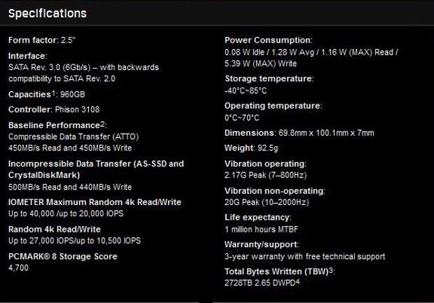 Utilizing a Phison 3108 controller, the SSDNow V310 can achieve sequential read speeds of (up to) 450 MB/s, and sequential write speeds of (up to) 450 MB/s. Random 4K read speeds are stated as (up to) 27,000 IOPS, with random 4K write speeds of (up to) 10,500 IOPS. The 960GB capacity makes the SSDNow V310 a true and complete HDD replacement, allowing users to migrate their entire HDD over to the V310, often with storage capacity to spare.