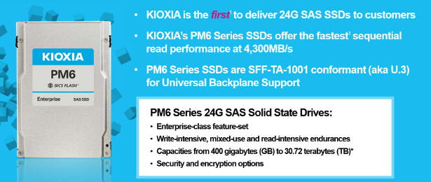 According to Alvaro Toledo, KIOXIA’s vice president of SSD marketing and product planning, “KIOXIA has one of the broadest SSD portfolios in the industry, and we are proud to lead the transition to SAS-4. By building our PM6 around 24G SAS technology, we’re once again raising the bar for enterprise storage performance, reliability and data protection.”