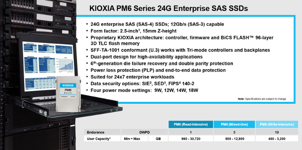 KIOXIA (formerly Toshiba Memory America, Inc.) is announcing the PM6 SAS SSD for enterprise server / storage applications. The PM6 represents KIOXIA’s 6th generation of enterprise SAS SSDs, and makes them the industry’s first supplier of 24G SAS technology.
