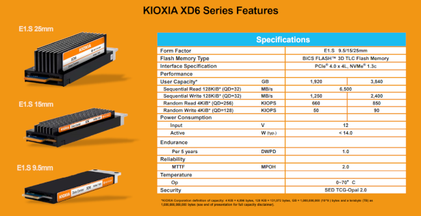 KIOXIA is an active and contributing member for industry development of EDSFF E1.S/L and E3.S/L solutions, and continues to collaborate with leading storage and server system developers to help achieve the full power of flash memory, PCIe, and NVMe. The XD6 drives are now sampling with select customers. For more information, pleas visit www.KIOXIA.com.