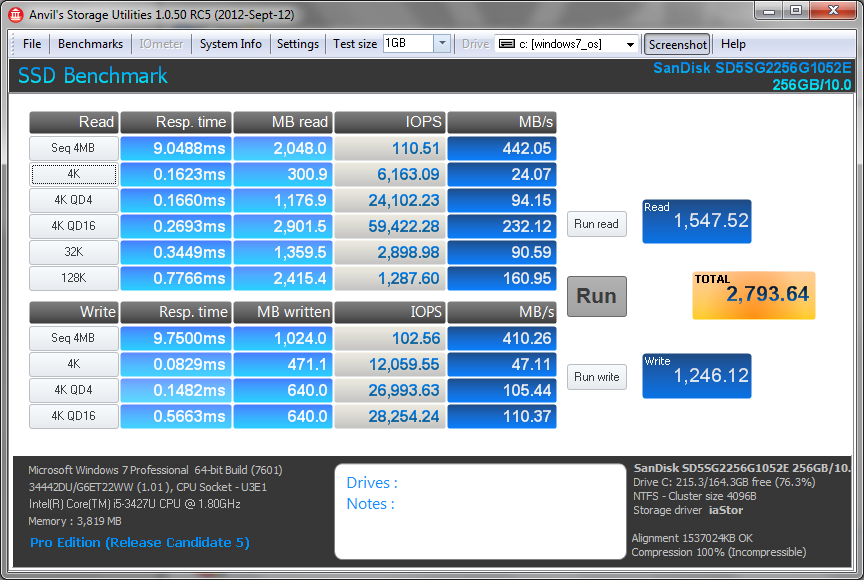 Anvil Storage Utilities identify the Lenovo X1 Carbon configuration on the bottom left with the SSD identified on the bottom right. Nothing really knew is learned from this benchmark, however, it does a good job of confirming that of which has been shown thusfar.