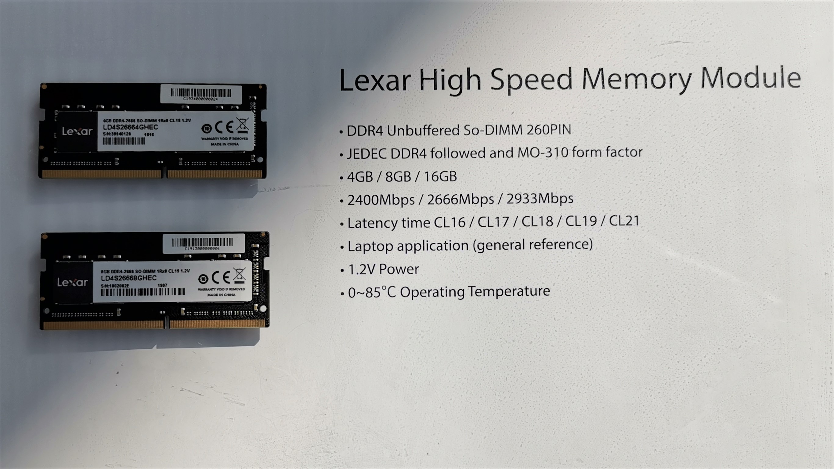Last up for today are Lexar Memory Modules. Available in 4, 8 and 16GB, these hit speeds of 2400, 2666 and 2933 Mbps.