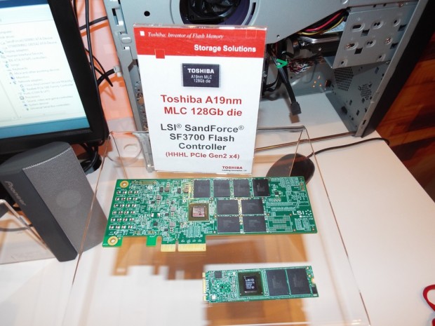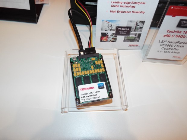 Toshiba had several newer products on display, including a 2.5″ form factor SATA 6Gb/s SSD that features both Toshiba’s A19nm MLC NAND and the new LSI SandForce SF3-700 controller, as well as a PCIe Gen 2X4 SSD featuring the SF3700. Toshiba also had on display their latest 19nm eMLC enterprise-grade NAND.