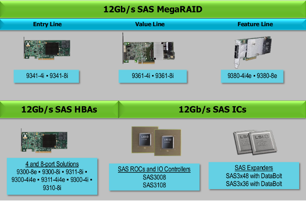 LSI Corporation is announcing two new key product families. The MegaRAID SAS 9300 family of 12Gb/s controller cards provide significant performance improvements for enterprise and hyperscale datacenters. A new family of 12Gb/s SAS expanders, including the new LSI SAS3x48, feature LSI’s unique DataBoltTM bandwidth aggregation that enables 12Gb/s SAS performance, while utilizing 6Gb/s drives. LSI’s new product families further expand their end-to-end portfolio of 12 Gb/s SAS product offerings, including SAS RAID-on-Chip ICs (ROCs), SAS IO Controller ICs (IOCs), and SAS Host Bus Adapters (HBAs).