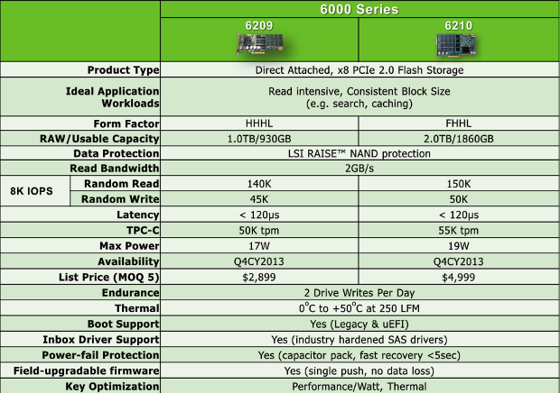 The LSI Nytro XP is being offered in two versions. The XP6209 is the 1.0TB model, with the XP6210 featuring 2.0TB. Both models are direct attached, PCIe 2.0 X8 flash storage. The XP6209 is a half-height card, and the XP6210 is full-height to accommodate the full 2.0TB of MLC NAND. Both models feature 2GB/s of read bandwidth.