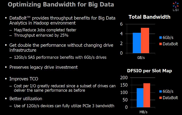 LSI’s DataBolt technology provides increased throughput performance for Big Data Analytics in Hadoop usage environments. Map/reduce jobs complete faster, and throughput realizes a 25% boost. DataBolt permits double the performance without changing drive infrastructure, thus preserving your existing drive investment. Cost per I/O is greatly reduced since the same performance as before can be achieved with less drives, thus greatly improving TCO.