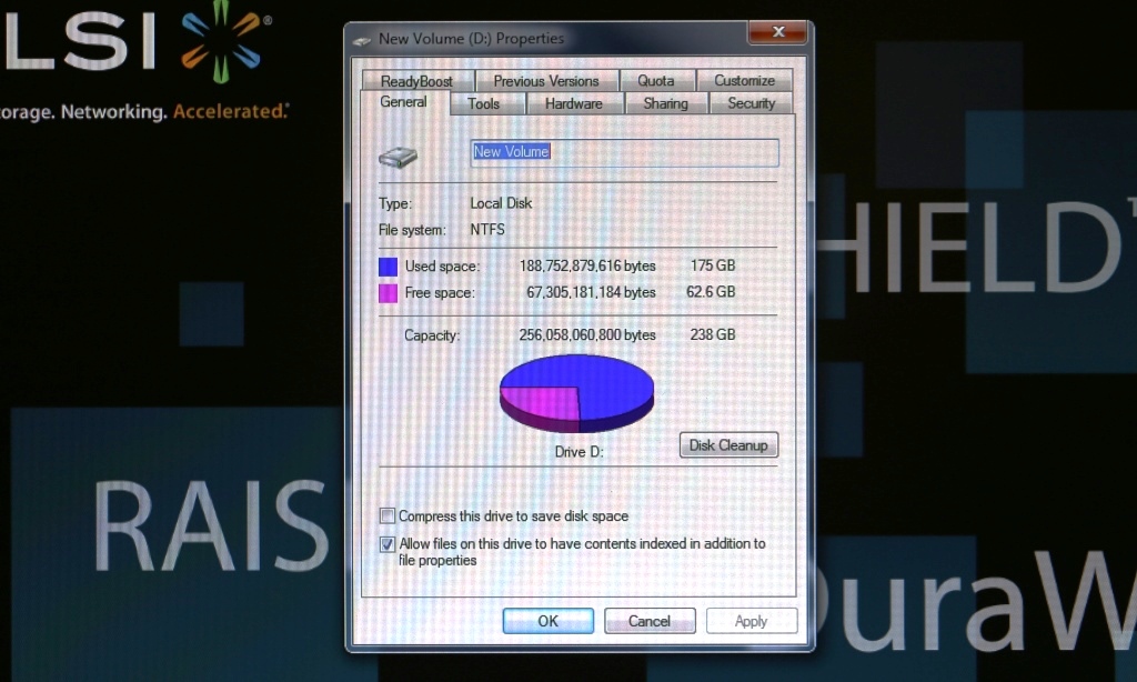 Similar to original DuraWrite technology where DuraWrite typically gave space back to overprovisioning when storage was complete, it has now directed it to provide that space to the end user’s capacity. In this live demonstration example above, the blue line is the physical capacity where the red line is the physical capacity used and the green is the virtual capacity used. Still not convinced? Let’s make it easier with simple Window’s Volume Properties:
