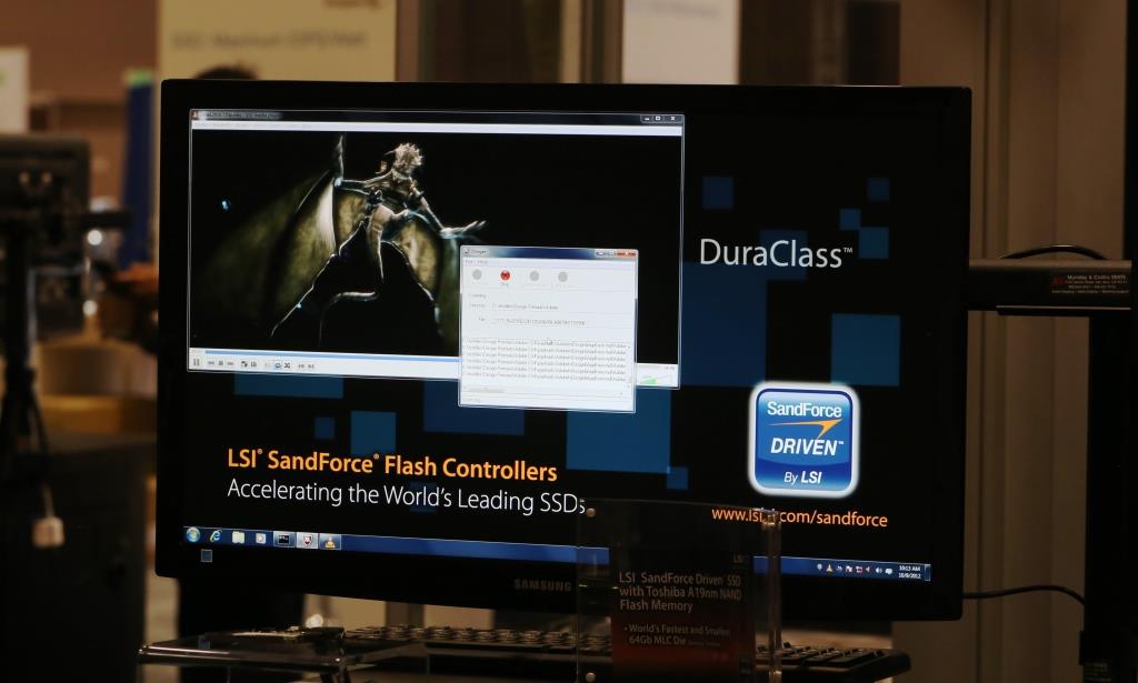 In a similar display, and without any future discoveries we are sure, LSI SandForce was the first to display a working model SSD with Toshiba’s new A19 NAND flash memory this week at FMS in Santa Clara. Toshiba has recognized this memory as being the smallest and fastest MLC memory available, being a 64Gb NAND die (94 square mm) with write speeds up to 25MB/s per die.