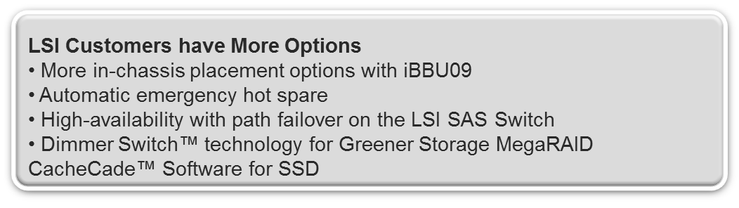 To achieve equivalent IOPS performance levels using competing high-performance 6Gb/s SAS RAID controllers could require as many as 3 additional RAID cards, 24 additional SSDs and 3 external 12-drive JBOD enclosures. This translates to a 3x increase in rackspace and power consumption and significantly higher hardware acquisition costs.