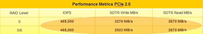 Users can boost IOPS performance to 465,000 RAID 5 random IOPS utilizing a single controller, enabled with LSI MegaRAID FastPath software, connected to 8 SSDs.