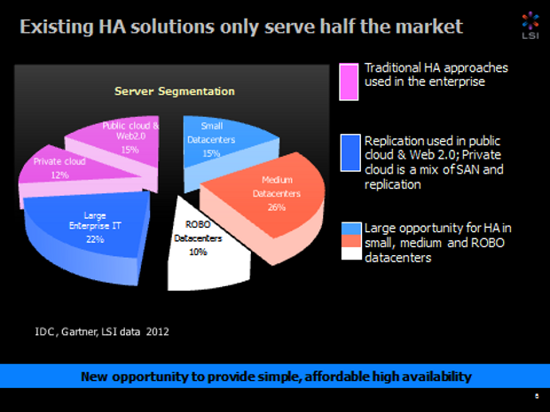 And for an independent viewpoint, Dan Iacono, research director of Storage Systems at IDC, remarks that “As the SMB market experiences about 30% growth year-over-year, the value of the data grows with it and increases the need for higher availability storage systems. By enabling SMBs to lower the cost of their storage systems while simultaneously protecting their businesses with high availability solutions like LSI’s Syncro CS, business efficiency is greatly improved.”