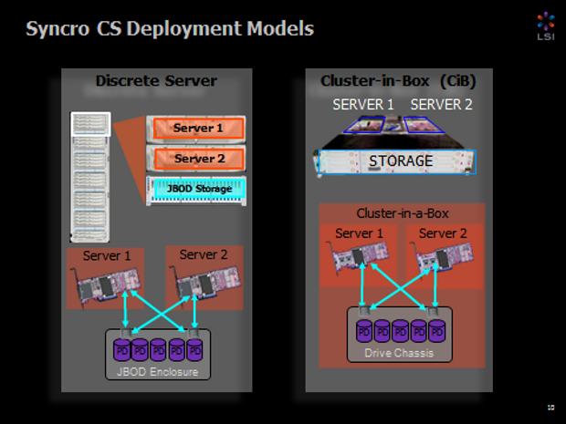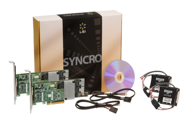 The Syncro CS 9271-8i — This version enable OEMs and system builders to use LSI’s Syncro CS controllers to build a cost-effective, two-node Cluster-in-a-Box (CiB) that delivers high availability in a single self-contained unit.
