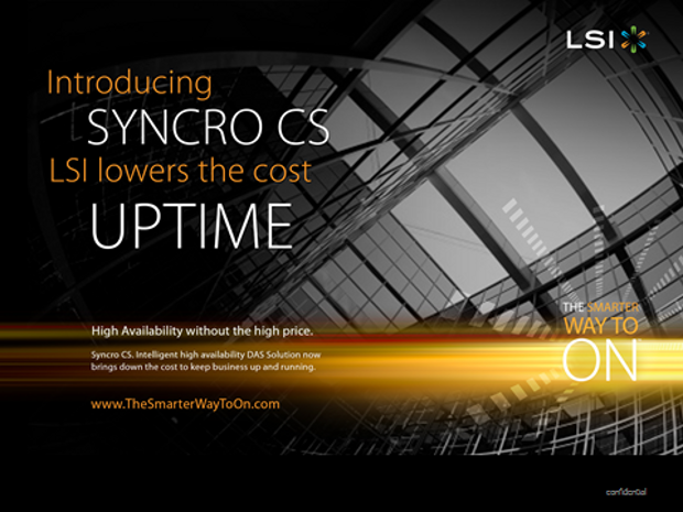 Even small and medium-sized operations require high availability of storage systems. When critical data and routines are not accessible, lost revenue and productivity can result; which often leads to customer dissatisfaction. The LSI Syncro CS reduces downtime for critical applications, and makes failover latency transparent to the applications and users. The Syncro CS offers high performance, robust data protection, and low cost and low complexity that is inherent in DAS solutions while adding the new benefits of shared storage and higher availability.