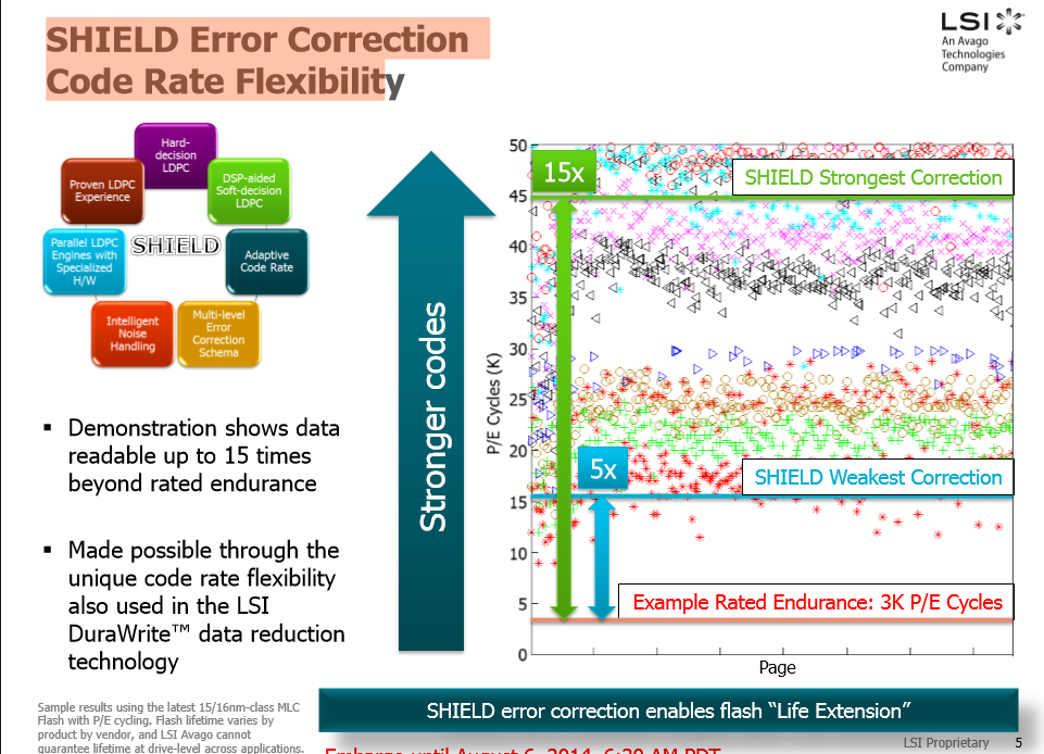 Now for their focus on NAND endurance… LSI demonstrated their SHIELD Error Correction and Code Rate Flexibility. SHIELD uses hard and soft LDPC and DSP technology. As a result, it and their other technologies together can increase NAND endurance by 5x-15x. That means at minimum, it can make typical 3,000P/E cycle MLC NAND and make it last up to 15,000P/E cycles and with their highest error rate correction, it can make MLC NAND last up to 45,000 P/E cycles!