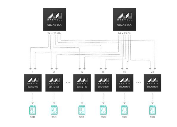 The SSD converter controller is enabling a new class of low-latency, low-power and high-performance Ethernet Bunch of Flash (EBOF) storage appliances. Looking at a typical upper-tier 2U24 rack with Gen3x4 SSDs, the 88SN2400 is able to support up to 18,000,000 (18 million!) input/output operations per second (IOPS). By pairing the 88SN2400 with a Marvell Ethernet switch that supports 2Tb/s, data center operators will have access to a 150GB/s pipe of pooled storage, and improved power consumption per I/O as compared to general purpose storage architectures. The 88SN2400 occupies a small footprint, and is able to be attached to existing backplanes, simplifying servicing and eliminating a single point of failure. Marvell anticipates designing this technology also into future Marvell SSD controllers and emerging SCM controllers.