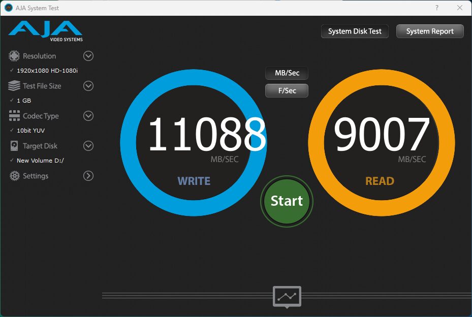The AJA Video Systems Disk Test is relatively new to our testing and tests the transfer speed of video files with different resolutions and Codec.