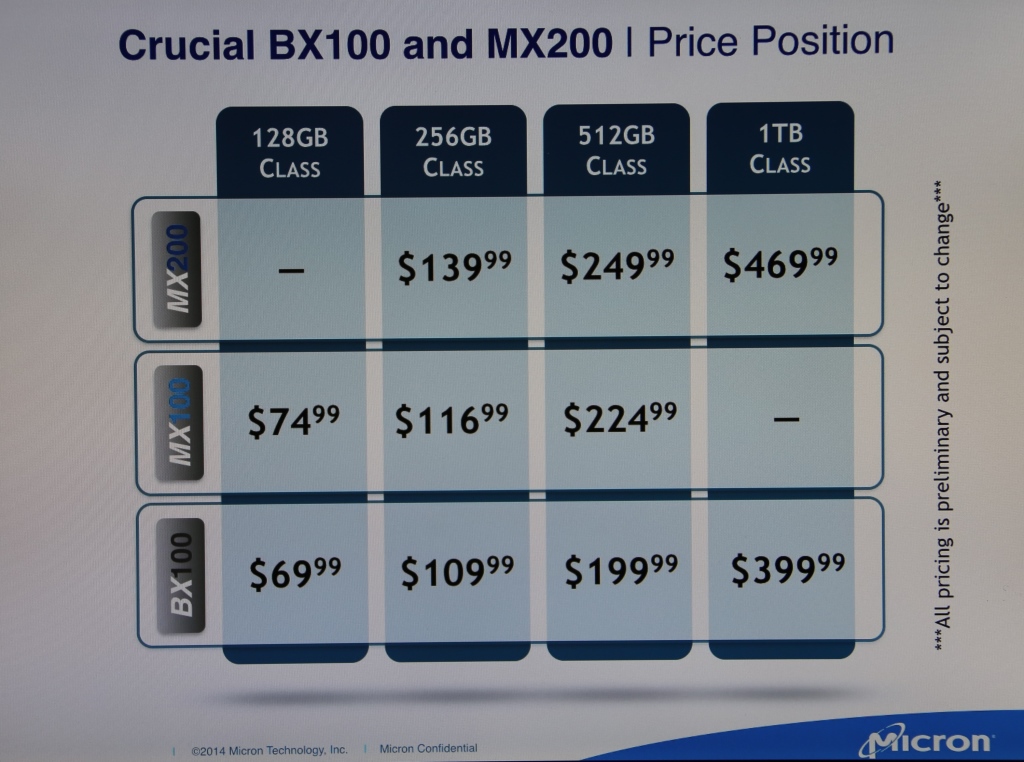 Will need to widen the margin between bx100 and mx200, I expect the bx100 to be even cheaper than the slides let on. After all this is still 2d nand, and the only thing bx100 will have is cheapest cost per GB .. hmm 110-120gbp for 0.5TB sounds about right?
