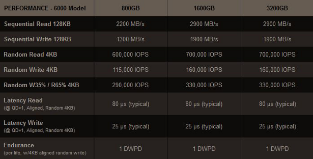 Z-Drive 6000 SFF Series for read-intensive applications – available in 2.5” small form factor (SFF) and capacity points of 800GB, 1.6TB and 3.2TB. Sequential read speeds of (up to) 2900MB/s and sequential write speeds of (up to) 1900MB/s are best-in-class. Random 4K read speeds are stated as (up to) 700,000 IOPS, with random 4K write speeds of (up to) 160,000 IOPS, as well as very low write latency of 25 microseconds, and read latency of 80 microseconds. This series utilizes Toshiba A19nm MLC NAND. Availability is anticipated for Q2 of 2015.