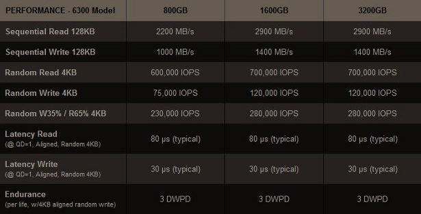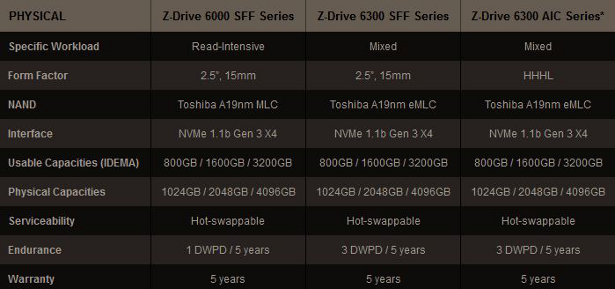 Z-Drive 6300 AIC Series for mixed workload applications – available as a Half-Height/Half-Length (HHHL) add-in card, and in capacity points of 800GB, 1.6TB, 3.2TB and 6.4TB. Performance characteristics are identical to the 6300 SFF series, and they both utilize Toshiba A19nm eMLC NAND. All capacities of the 6300 AIC series are anticipated to be available in the second half of 2015.