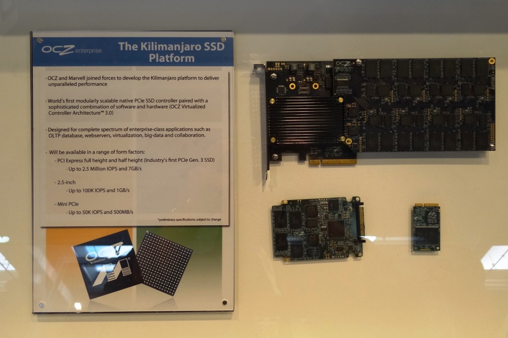 Just as interesting, however, was this picture of OCZ’ expected release of the Kilimanjaro platform where the soon to be released Z-Drive R5 is pictured with a 2.5″ and mSATA form factor. This platform is a joint venture between OCZ and Marvell and, if these specs are correct, that 2.5″ SSD will push 1GB/s transfer speeds with 100,000 IOPS. This would be the top speed seen in any typical notebook form factor yet.