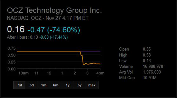 OCZ anticipates filing a bankruptcy petition shortly after the Toshiba and Hercules documentations are completed. More details should be released once the OCZ bankruptcy petition is officially filed. If the deal with Toshiba falls through, this would leave OCZ little choice but to then file a bankruptcy petition that would specify liquidation. Trading of shares of OCZ was suspended at 9:00 AM EST this morning, and resumed at approximately 2:30 PM EST this afternoon. Share were down almost 77% to only 15 cents / share as of time of this posting.