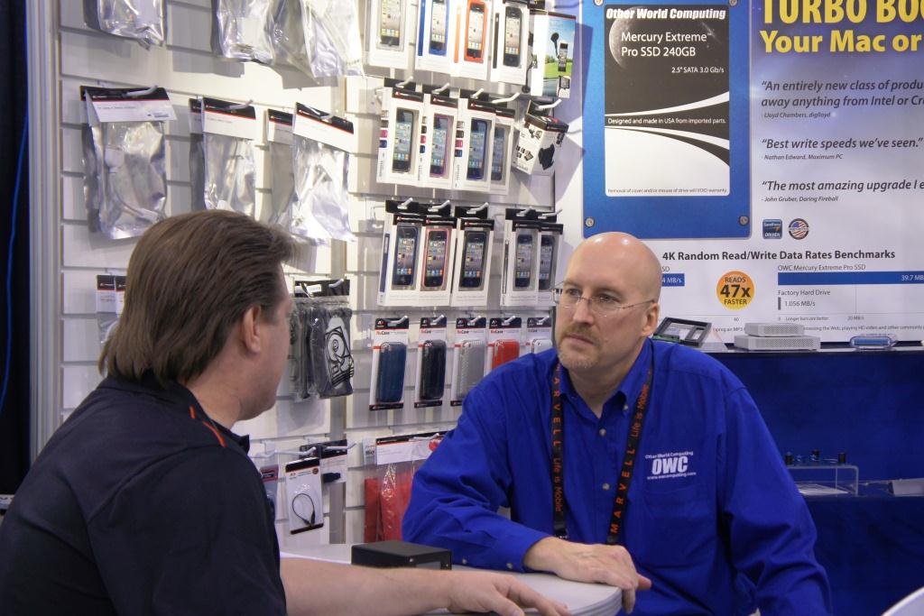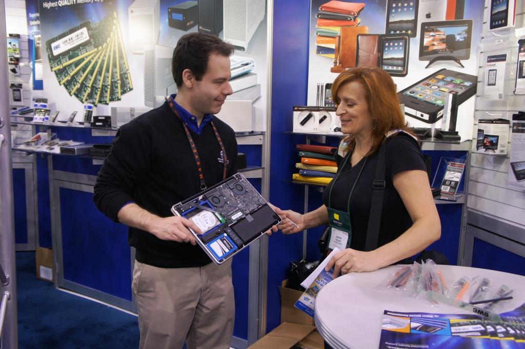 Add to that the family atmosphere, next day shipping, value and immediate customer service and OWC is simply a great company for PC SSD sales as much as Mac. Congrats on such a successful CES OWC and heres is a closing picture of Rick Van Dyke, OWCs Sales Manager, showing our Associate Editor the benefits of being able to include both a hard drive and SSD as a boot drive in a Mac notebook.