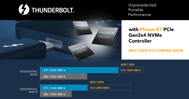 Phison is announcing the addition of Thunderbolt connectivity to its line of E7 and E8 controllers. The newest E7 is a PCIe Gen3x4 NVMe controller with the Thunderbolt connectivity delivering unprecedented portable performance. The E7 with Thunderbolt delivers sequential read speeds of up to 2500MB/s, with sequential write speeds of up to 1500 MB/s. The more mainstream E8 with Thunderbolt delivers sequential read speeds of up to 1500MB/s, with sequential write speeds of up to 1000MB/s.