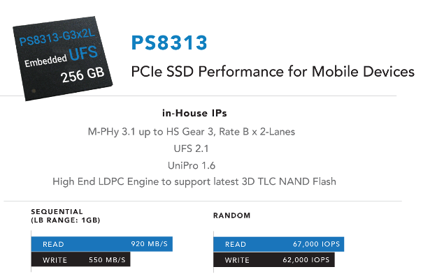 Additionally, Phison is announcing the PS8313 UFS controller, providing PCIe SSD performance for mobile devices. The PS8313 pairs with 3D TLC NAND to deliver sequential read speeds of up to 920MB/s, and sequential write speeds of up to 550MB/s. Random read speeds are stated as up to 67,000 IOPS, with random write speeds of up to 62,000 IOPS.